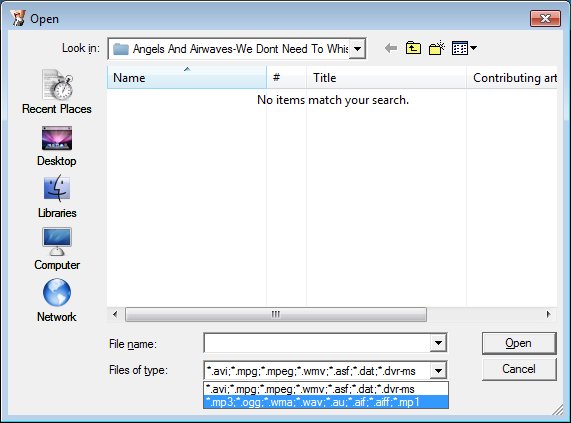 lalu pilih lagu atau video yang akan kita pilih. Jika daftar lagu tidak muncul ubah kelompok format pada kolom Files of type.